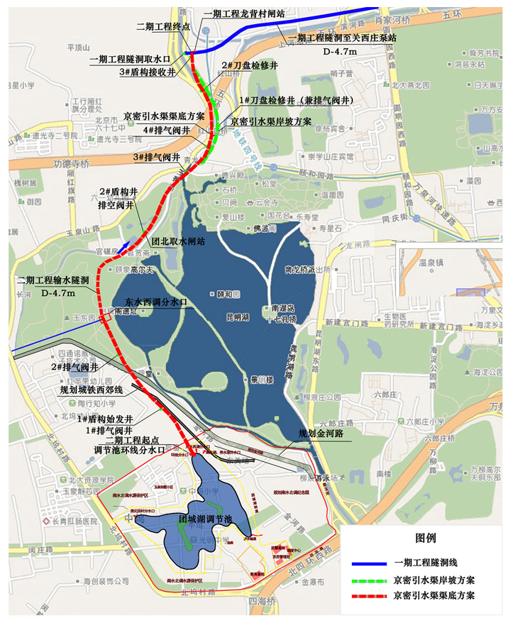 团城湖至第九水厂输水工程(二期)地处北京市西部地区,起点位于海淀区的团城湖调节池,终点为海淀区龙背村附近,与已建成的团城湖至第九水厂输水工程(一期)对接。全长约 4.3 公里,为一条内径 4.6 米的钢筋混凝土隧洞。