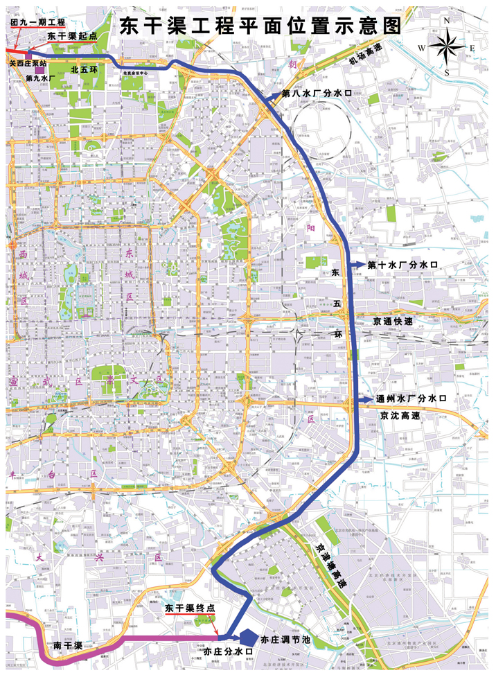 东干渠工程位于北京市朝阳、大兴两区,起点与团城湖第九水厂输水工程关西庄泵站北侧分水口相接,基本沿五环路布置,终点到大兴区亦庄调节池附近与南干渠末端相接。其承担着北京东北部及东部地区,包括为中心城第八水厂、第十水厂、通州水厂、亦庄水厂和永乐水厂等,提供南水北调和密云水库水源的任务。